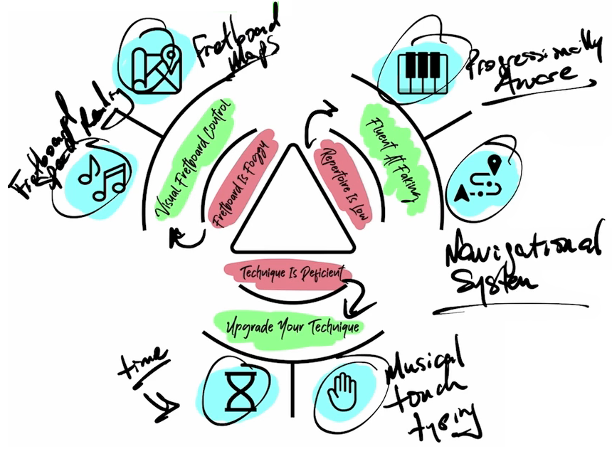 Most players have in fact been grinding: arpeggios, scales, rote note-memorization. The issue isn’t effort—it’s the map. You’ve been struggling to absorb the fretboard the hard way, not the smart way.